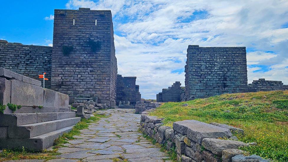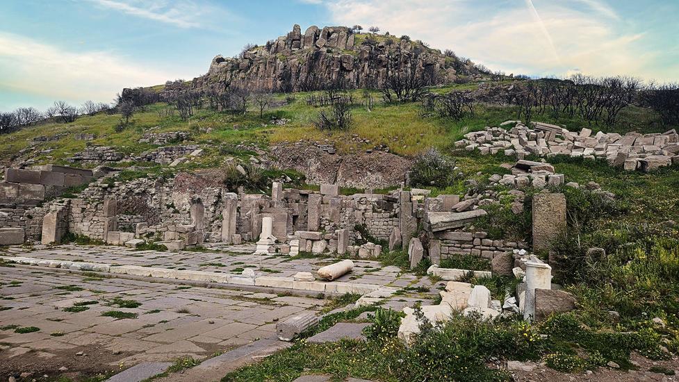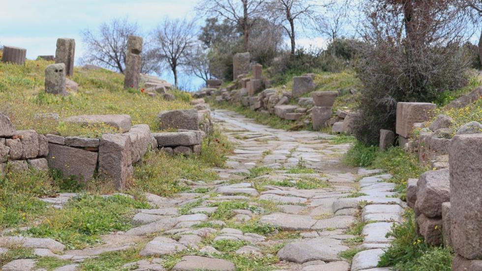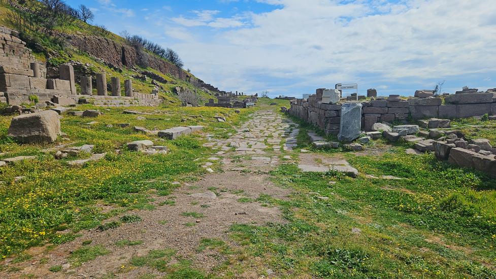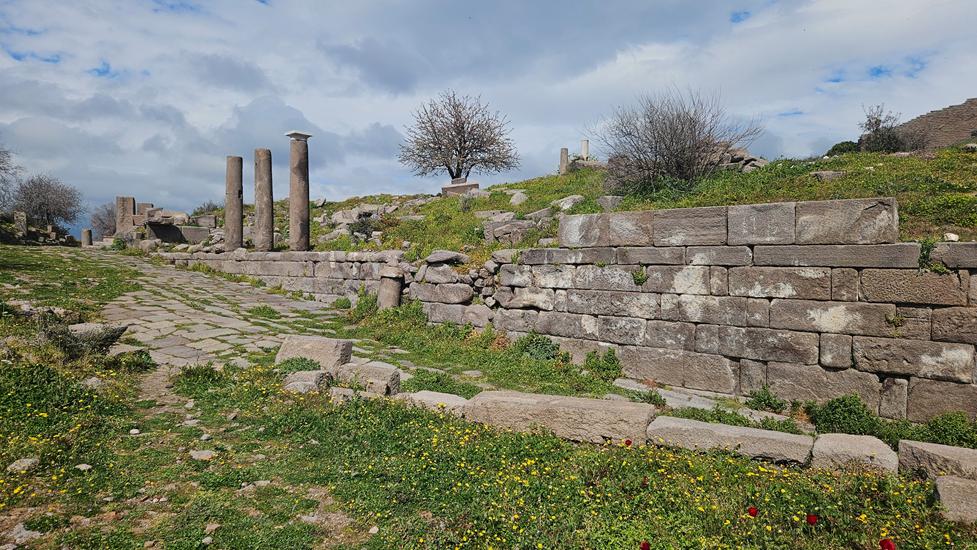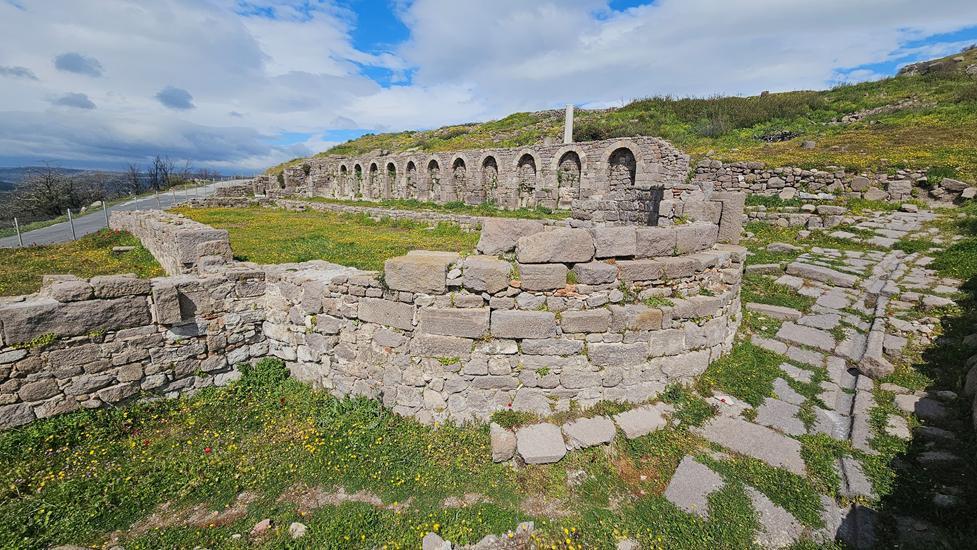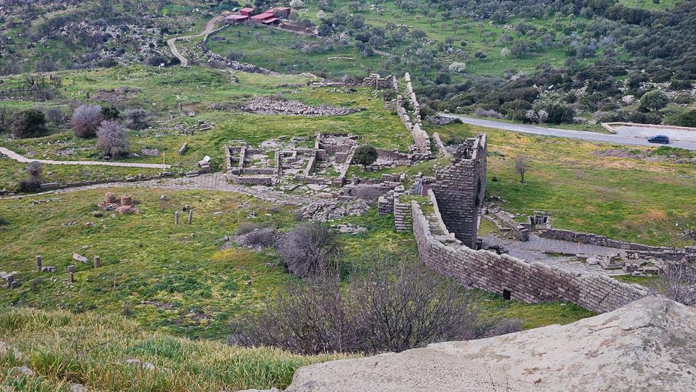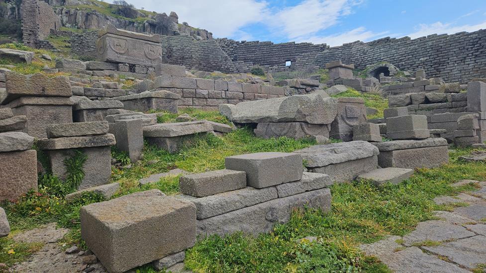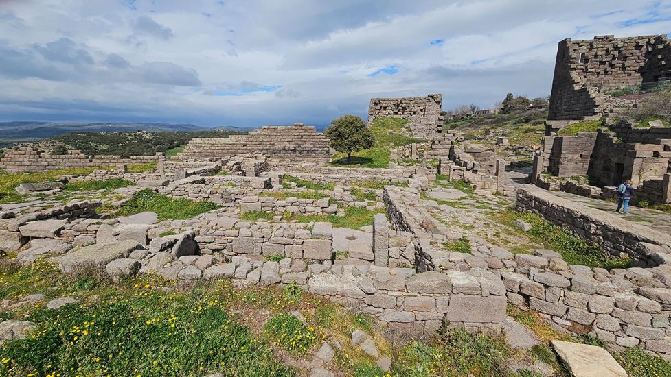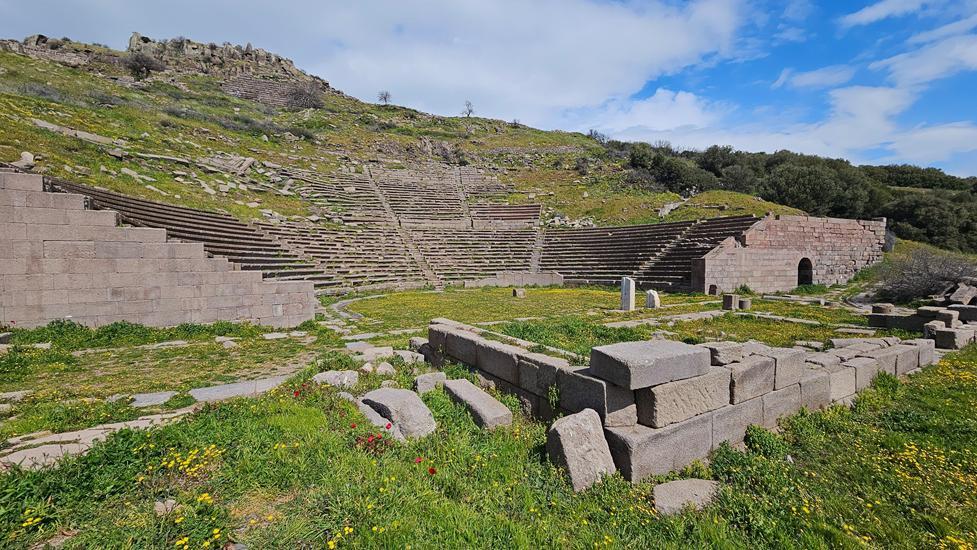 Weiter unten steht ein gut erhaltenes Amphitheater, das 5000 Plätzen für Besucher bot. Wir setzten uns oben in der Mitte hin und blickten auf die Bühne hinunter. Es breitete sich ein fantastisches Glücksgefühl in uns aus. Einen schöneren Ort für ein Theater kennen wir nicht. Wie mag der Eindruck auf die Darbietungen gewesen sein, wenn dahinter Meer und die Insel Lesbos als große Naturkulisse zu sehen waren? Es muss grandios gewesen sein.