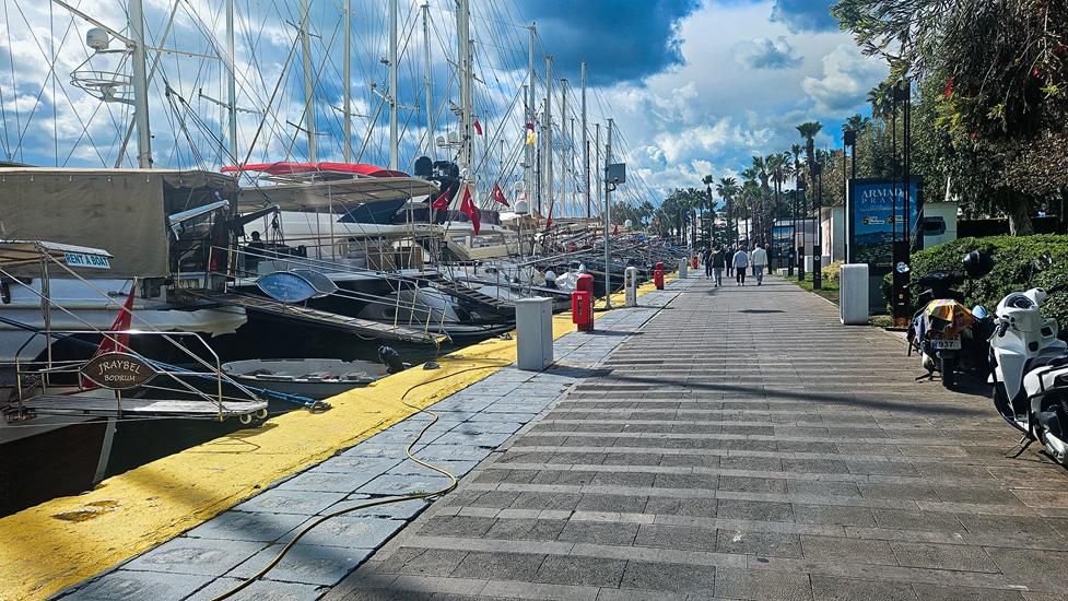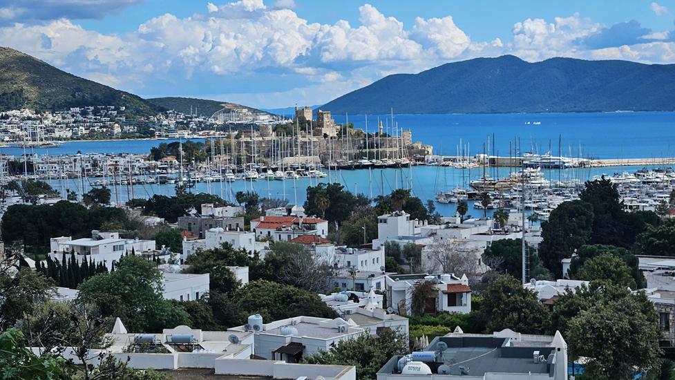 Nach 24h Dauerregen machten wir uns bei Sonnenschein auf in Richtung Bodrum. Bei dieser schönen Fahrt fuhren wir oft auf einer guten zweispurigen Straße. Es ging vorbei an dem großen Bafa See, der malerisch von Bergen umrahmt ist. Teilweise kamen wir an landwirtschaftlich geprägten Dörfern vorbei. An der Küste bekamen wir in Güvercinlik eine schöne Bucht zu Gesicht. Ab hier wurde es zusehends touristischer, denn immer mehr Ferienwohnungen und Hotels nahmen wir wahr.