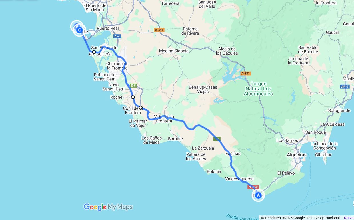 Strecke: Cádiz– 110 km, leicht bewölkt, 20 Grad