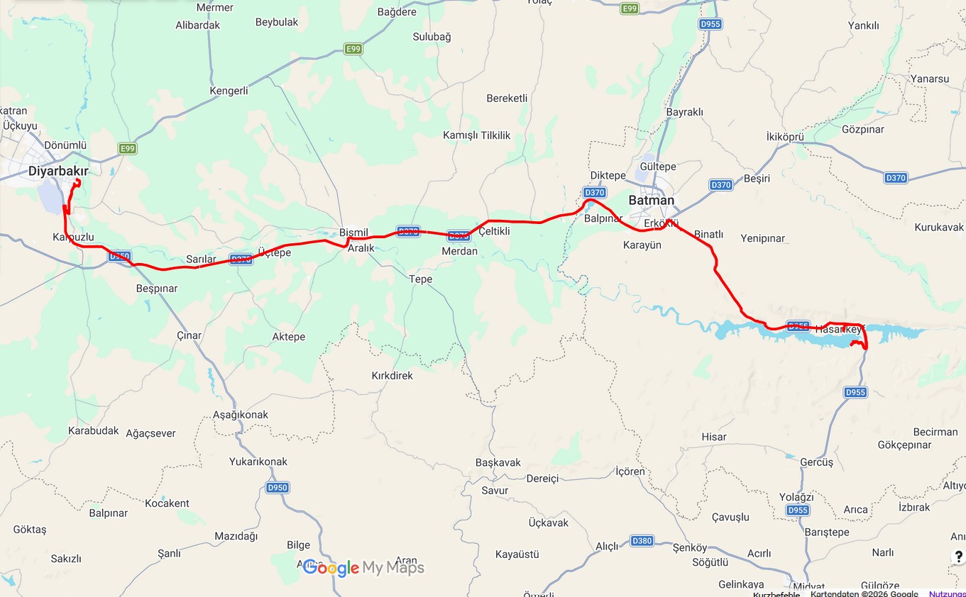 Bereits im Jahre 2024 hatten wir Hasankeyf einen Besuch abgestattet. Dieses Mal wollten wir das Dorf intensiver anschauen und besichtigten sowohl das Ruinendorf, als auch das Ersatzdorf des gefluteten Hasankeyf incl. Museum. Das Dorf wurde 2020 aus traurigem Anlass berühmt, denn eine 15.000 Jahre alte Siedlung musste einem Stausee weichen. Einige Bauwerke hat man vor dem Fluten auf die Anhöhe gegenüber dem Ruinendorf verlegt. Andere Bauten blieben für immer auf dem Boden des Stausees. Das umgesiedelte Dorf hat man schließlich mit neuen Gebäuden „originalgetreu“ erweitert.