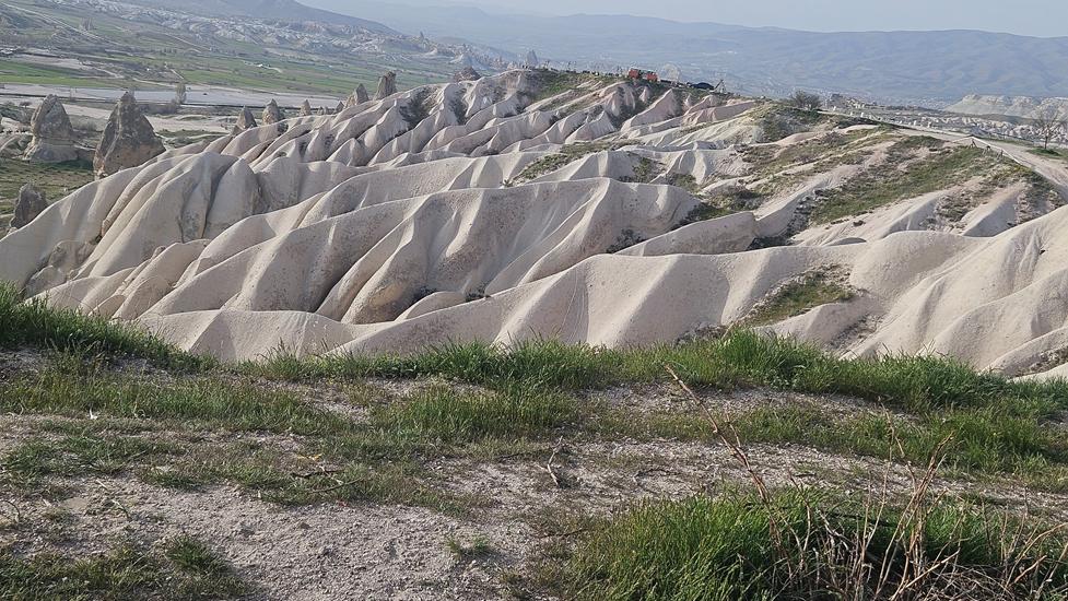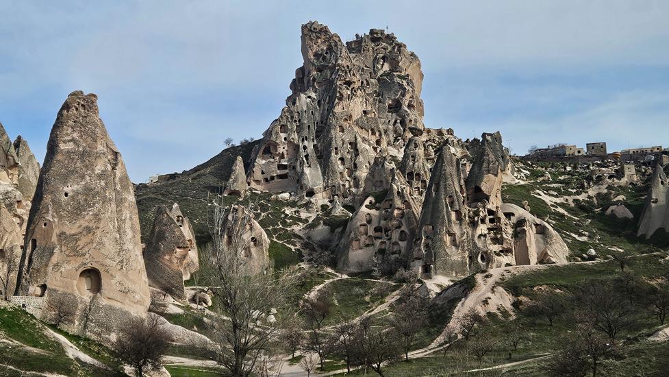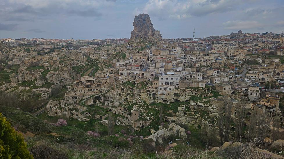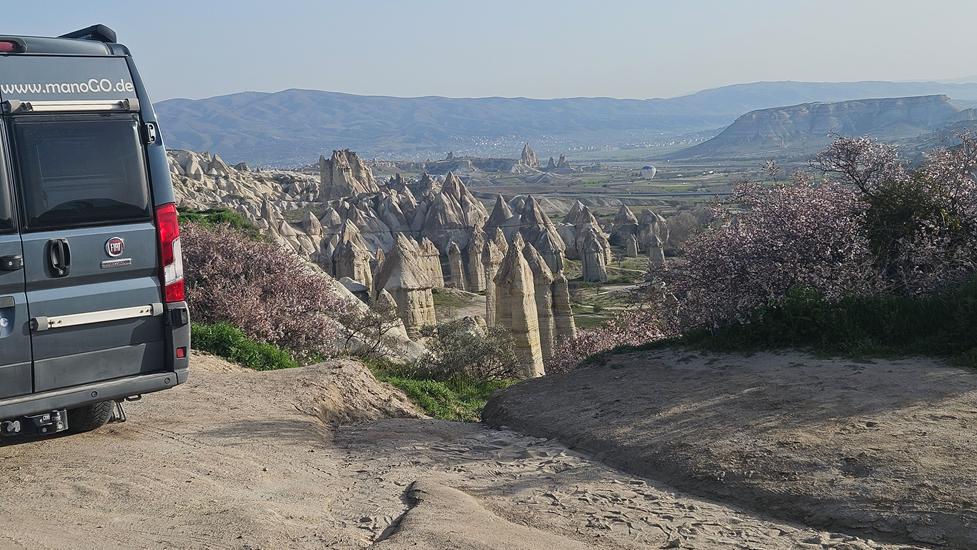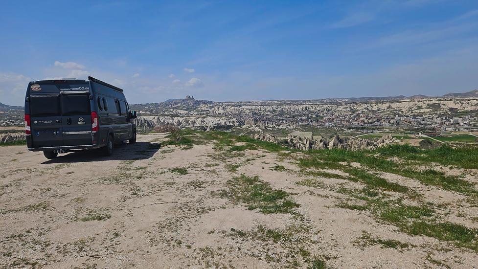 Das Wetter sollte in den nächsten Tagen sonnig bleiben, daher wollten wir ohne Umschweife von Ihlara via Uchisar nach Kappadokien, genaugenommen in den Ort Göreme fahren. Uchisar begrüßte uns bereits von weitem mit einem 60m hohen Burgfelsen. Rund um den Berg lag zu Füssen die Ortschaft Uchisar. In der nahen Umgebung standen die für Kappadokien typischen Tuffsteinsäulen. Kurz nach dem Ort der nächste Halt mit Blick in ein Teil des Pigeon Valleys. Bereits diese Landschaft löste in uns Begeisterung aus. In Göreme wollten wir das Love Valley anfahren. Dieses Unterfangen war nicht einfach.