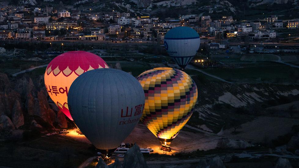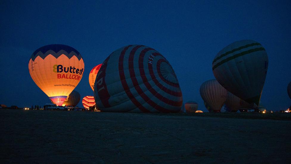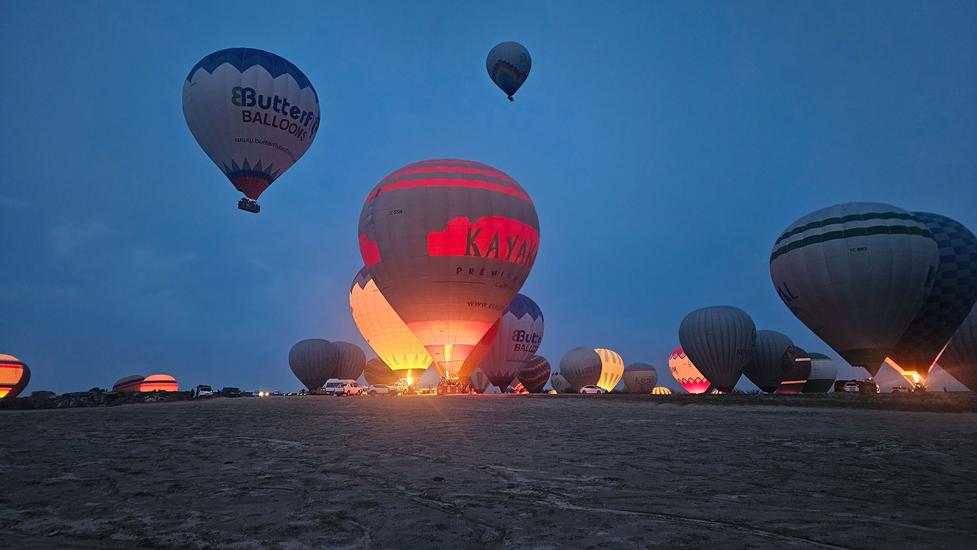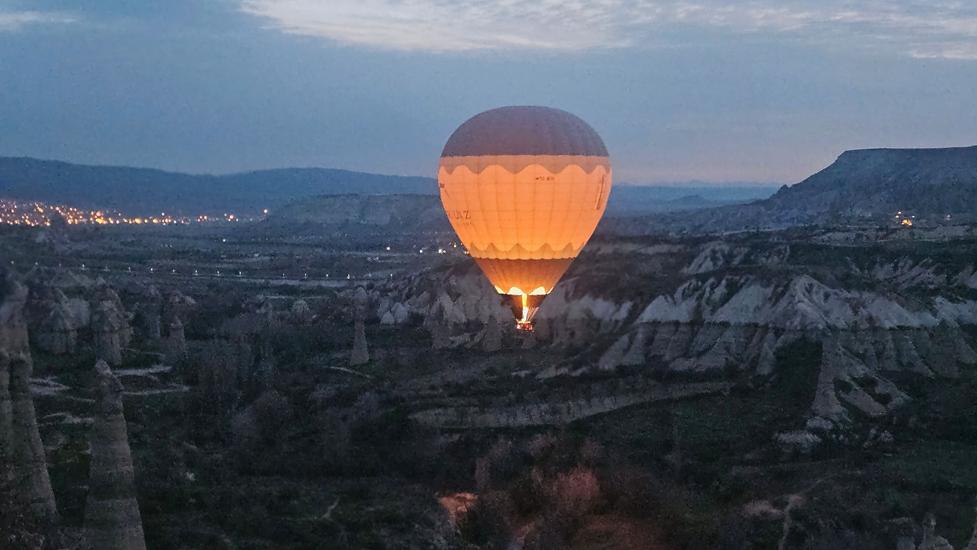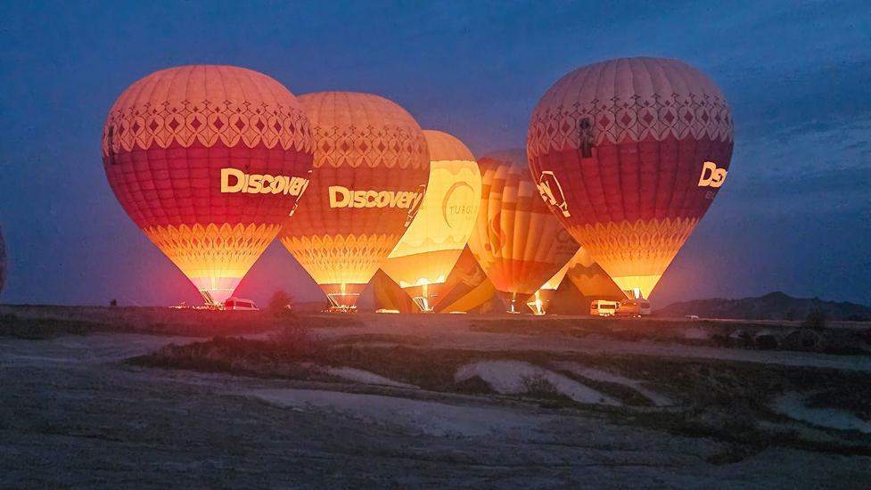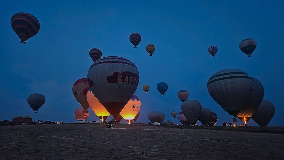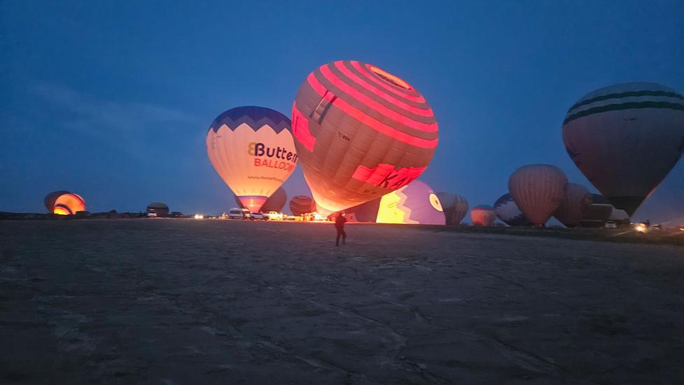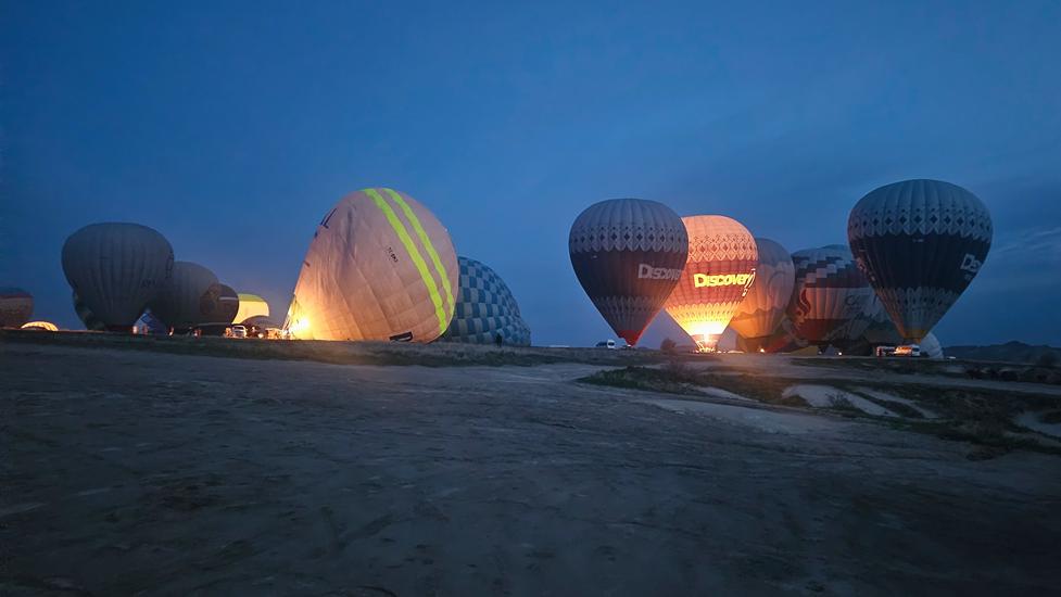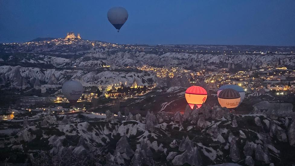 Am Morgen konnten wir zum 3. Mal ab 5:30 Uhr die Ballone genießen. In dieser Umgebung wurden weit mehr Ballone aufgeblasen als über dem Love Valley. Es war eine völlig neue Perspektive gegenüber dem vorherigen Platz, denn wir beobachten die Aktivitäten von oben und wir sahen wie die Ballone über Göreme flogen. Fantastisch die Ballone noch in der Dunkelheit über der beleuchteten Stadt zu sehen.