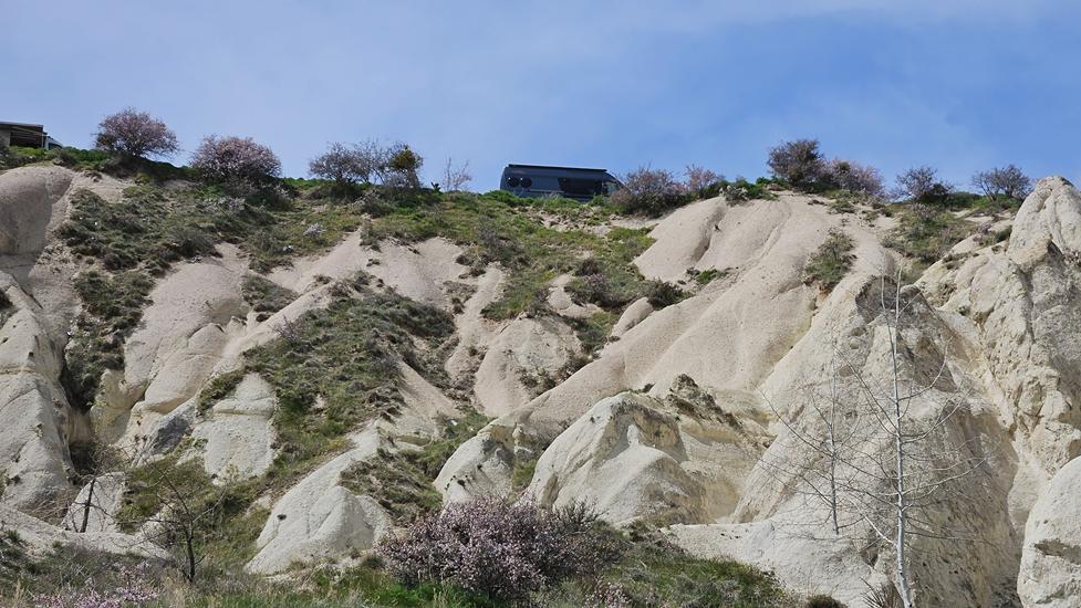 Wir nahmen Abschied von unseren chinesischen Helfern und begaben uns nach der Werkstatt auf ein Plateau zwischen Göreme und Rose Valley. Der Name stammt vom rosa schimmernden Gestein. Dahinter ist mit dem Red Valley ein weiteres beliebtes Tal, das aus den gleichen Gründen diesen Namen bekommen hat. Der Platz war wieder besonders, denn Göreme lag uns zu Füssen und dahinter sahen wir den Berg von Uchisar. Am Abend als die Ortschaften beleuchtet wurden, hatten wir einen fantastischen Ausblick in das Tal. Kein Geräusch störte diese Idylle.
