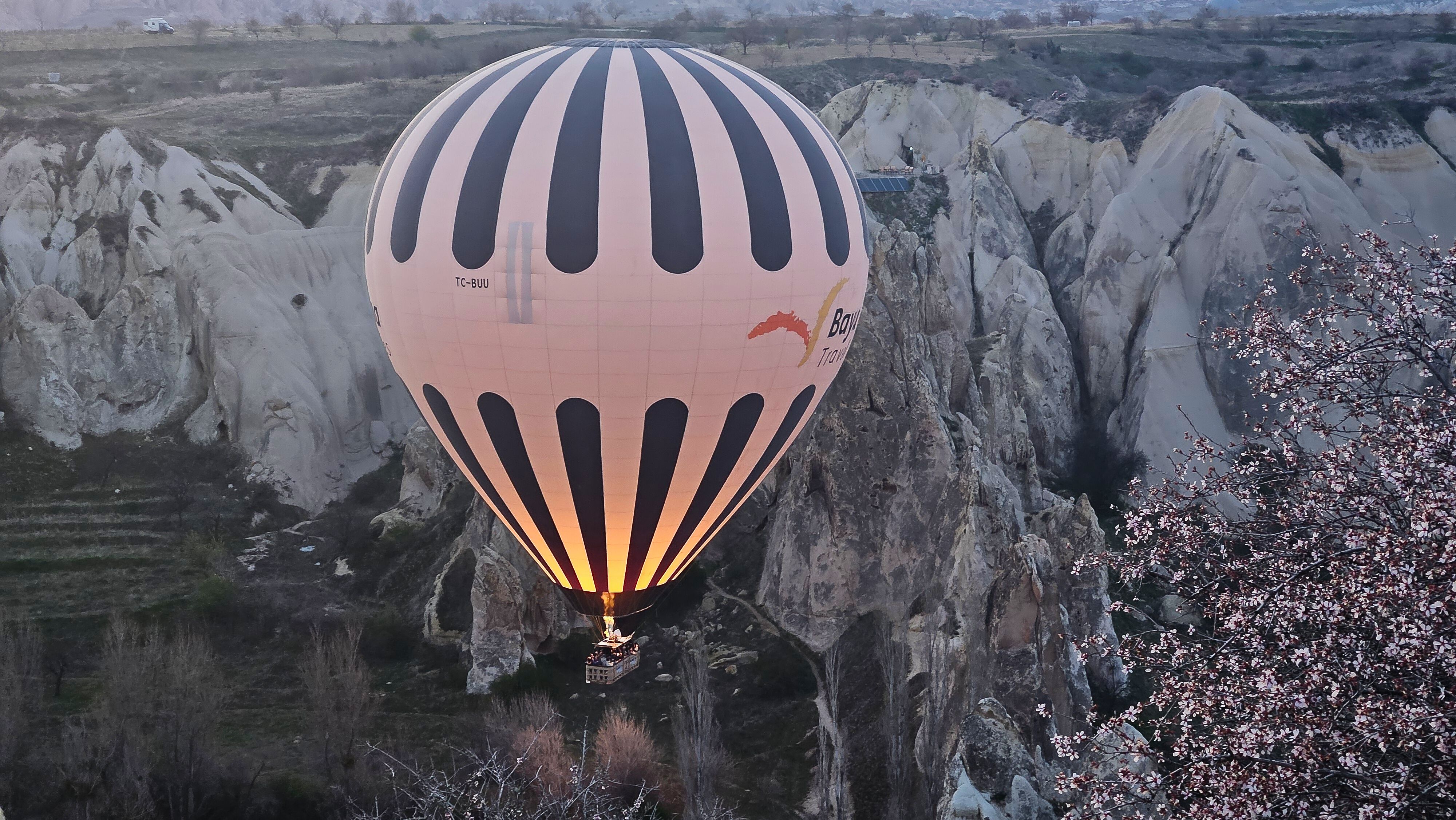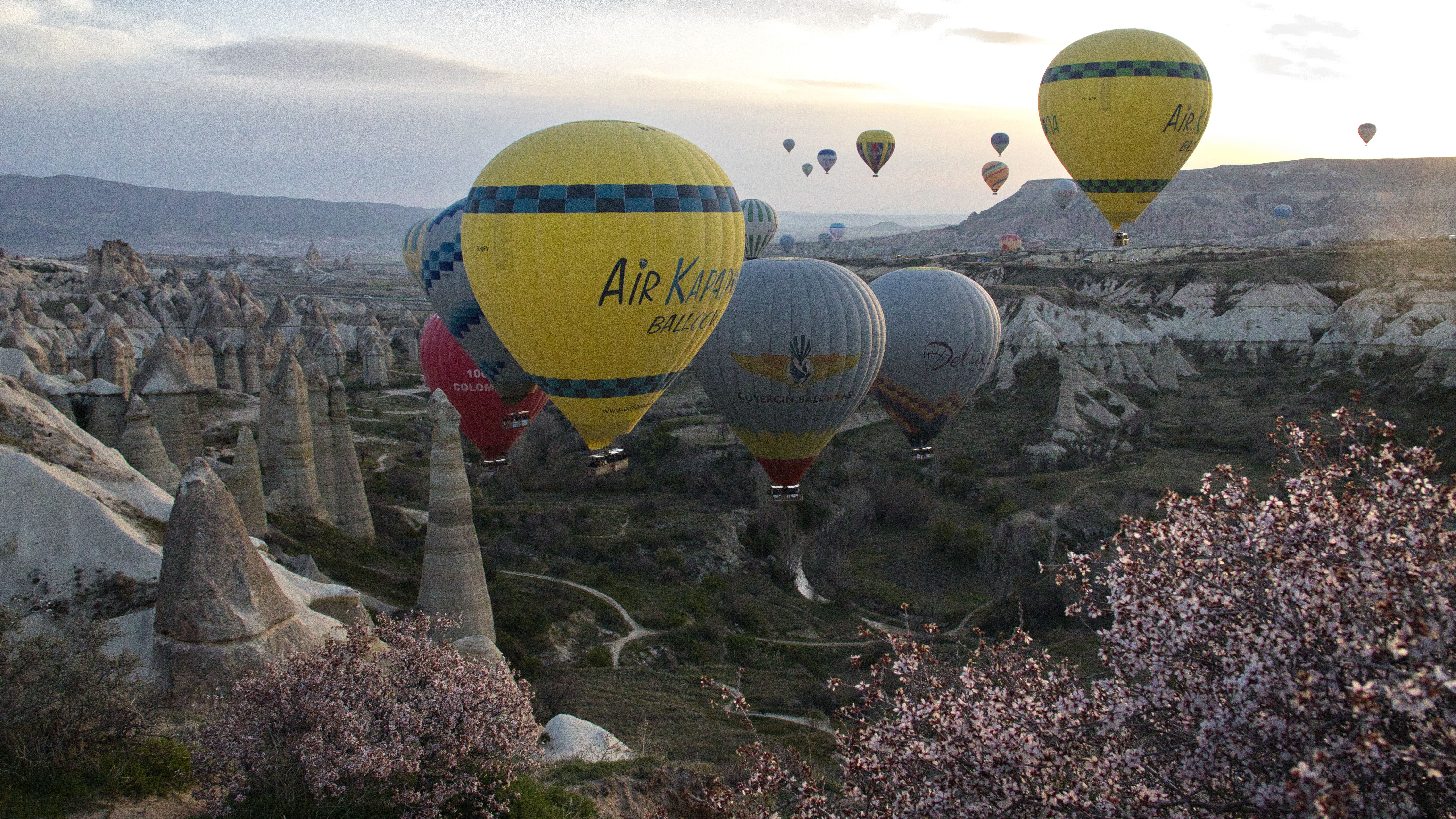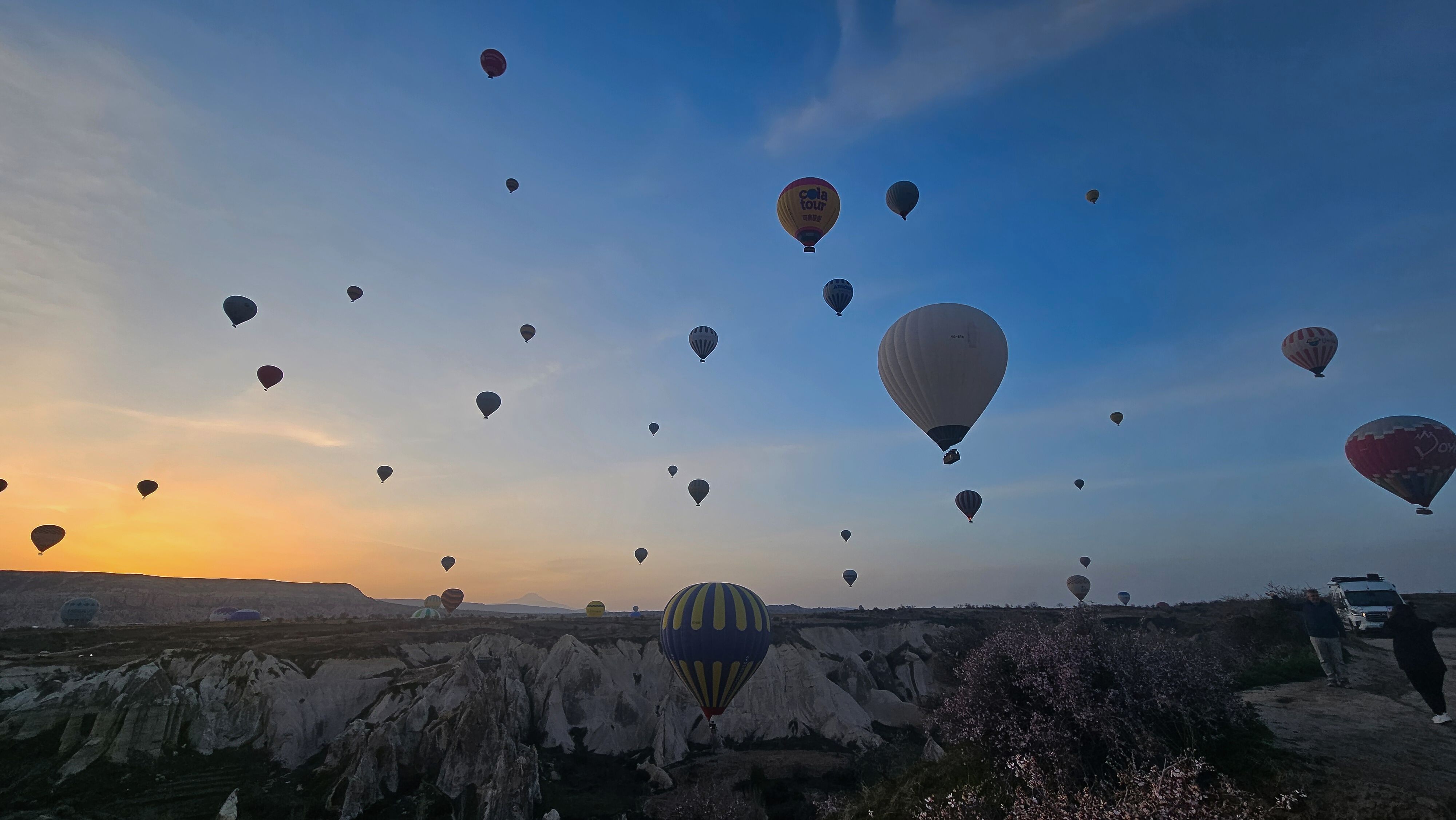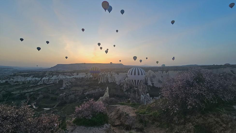 Einige Ballone flogen direkt ins Tal und nahe an den Feenkaminen vorbei. Die vielen Ballone hatten kaum Platz. Erhebend wie die Ballone nach einer gewissen Zeit aus dem Tal schnell in luftige Höhen emporflogen. Einer überflog unser Wohnmobil kaum um mehr als 1m. Zum Staunen diese Flugpräzision. Von überall kamen sie angeflogen. Der Himmel über Kappadokien war voll davon, dazu kam die aufgehende Sonne. Um 6:45 Uhr sahen wir nur noch wenige Ballone am Himmel. Sie landeten nach und nach im Tal. Es war einer der schönsten Morgen, den wir erlebten.