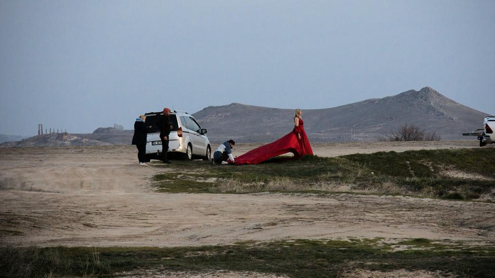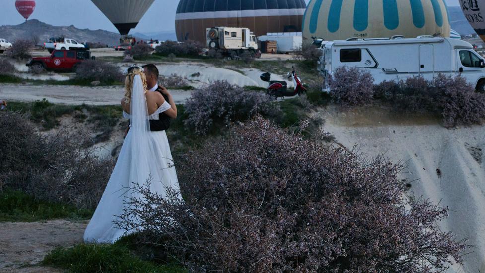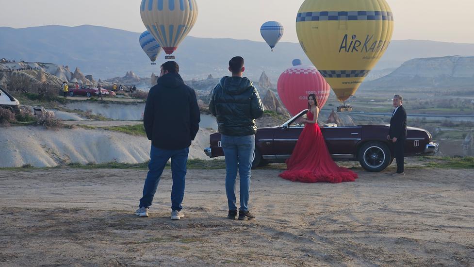 Während die Ballone im Tal und am Himmel flogen, kamen immer mehr Hochzeitspaare an den Platz. Diese Paare, möglicherweise aus aller Welt, kommen extra nach Kappadokien, um ein tolles Hochzeitsfoto zu erhalten. Manche Fotos werden mit einem Cadillac Cabrio als Requisit geschossen. Diese Freude in den Gesichtern der Bräute zu sehen, einmalig.