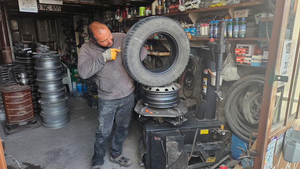 Dann kam das Problem, der hintere Reifen hatte bedenklich wenig Luft. Mit unserem Kompressor pumpten wir den Reifen nur langsam auf. Ein chinesisches Paar half mit ihrem besseren Kompressor aus. Am nächsten Morgen hatte der Reifen 0,4 bar weniger. Dies hieß, wir konnten eine weitere Nacht bleiben, denn einen besseren Ort um die Ballone zu beobachten gibt es nicht. Glück im Unglück. Nach 2 Tagen fuhren wir in eine Werkstatt. Der Monteur entdeckte schnell den 5 cm langen Nagel. Dieser hatte sich versteckt und das Loch nahezu verschlossen.
