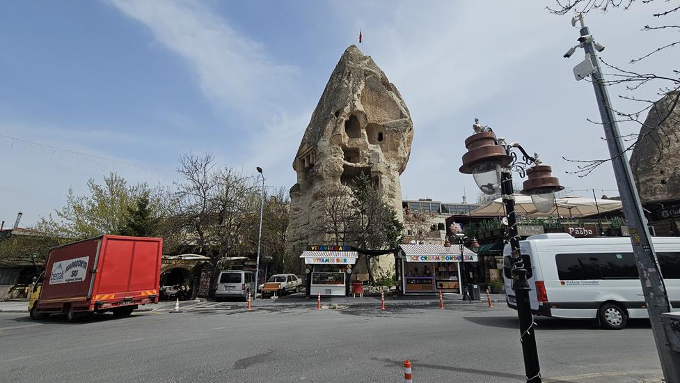 Ortahisar zählt laut Forbes zu den 50 schönsten Orte weltweit. So eine Auszeichnung ist für uns Grund genug in den Ort zu fahren. Ortahisar liegt nur wenige Kilometer südlich von Göreme. Mitten im Ort steht ein Burgfelsen, der mit 90m Höhe noch beeindruckender ist als der Felsen in Uchisar. Es ist ein riesiger Feenkamin, durchzogen mit Höhlen und Tunneln und weithin sichtbar. Vor dem Felsen ist eine Altstadtstraße mit viel Flair. Spontan hat der Ort uns fasziniert. Wir überlegten, ob wir nicht einen weiteren Tag bleiben sollten. Leider fanden wir keinen geeigneten Platz.