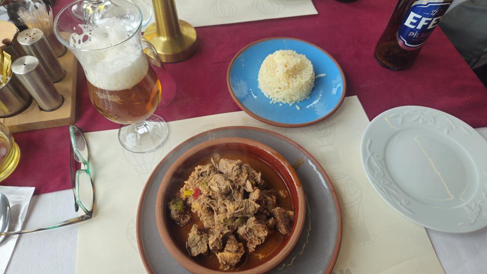 In diesem Restaurant wollten wir einen Testi Kebab bzw. pottery kebab essen. Dies ist eine Spezialität in Kappadokien. Das Gericht wird in einem Tontopf mit Reis serviert. Ein unheimlich leckeres Gericht. Da das Restaurant gerade geöffnet hatte, waren wir die einzigen Gäste. Das Restaurant bietet ein tolles Ambiente. Mit dem Wirt hatten wir ein nettes Gespräch. Die Rahmenmusik, die er für uns einspielte, hatte unseren Nerv voll getroffen. Es war eine tolle Zeit in diesem Restaurant. Am Ende kam die Rechnung mit einer Spieluhr, was für eine nette Idee.