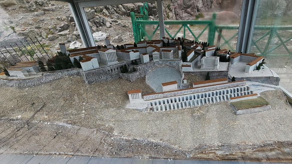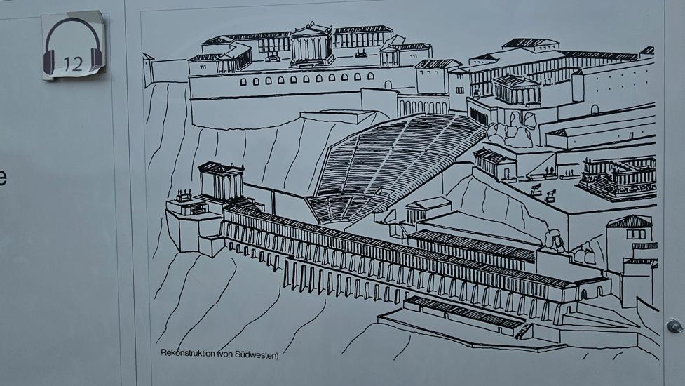 Dem Berg vorgelagert konnten wir ein sehr steiles Amphitheater sehen. Es bot 10.000 Besuchern Platz. Der Eingang auf die Ränge erfolgte meist von unten. Oben war zusätzlich ein kleiner Eingang vorhanden. Die Bühne, war eine Holzkonstruktion. Die Pfeiler wurde in vorgesehene Löcher gestellt. Grund war der nebenan stehende Dionysos Tempel. Damit die Sicht darauf frei blieb, wurde die Bühne nach den Vorführungen wieder abgebaut.