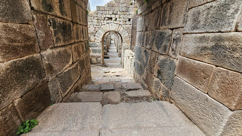 Weiter den Berg hinunter wurden die Wohnungen der Einwohner angesiedelt. Es folgte eine große Schutzmauer mit Einlasstoren. Die Besichtigungstour endet an dieser Stelle in Höhe der Talstation der Seilbahn nach ca. 3,5h. Ein Ausgang ist hier vorhanden. Es ist von hier ein kurzer Weg zur Seilbahn oder Bergama.