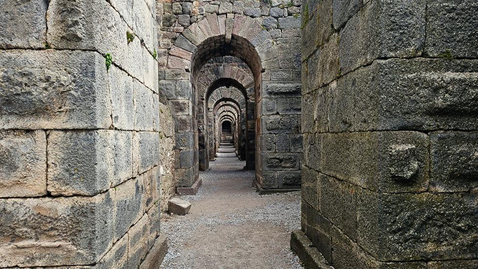 Um die Fläche an der Oberseite zu vergrößern, wurde bisher ein Berg teilweise abgegraben und mit Stützen untermauert. Die Fläche war durch diese Technik beschränkt. Die Römer machten sich davon unabhängig. Sie bauten statt Stützen parallele Tragmauern, die sie mit Tonnengewölben überdeckten, dabei wurde sogar Material gespart. Die Begrenzung ergab sich alleine aus der Mauerhöhe, die in diesem Fall 23m war. Das Material war eine Art Beton mit dem Namen Opus caementicium. So wurde die Fläche für den Trainaus Tempel vergrößert. Schreitet man durch diesen Teil ist man sprachlos, wie weit die Baukunst zu dieser Zeit gewesen ist.