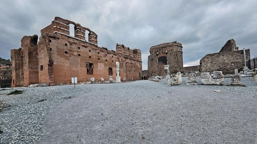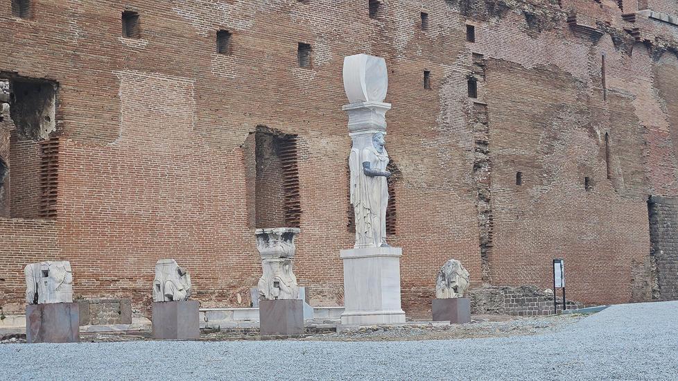 Im alten Bergama befindet sich ein sehr großes Bauwerk, die sogenannte Roten Halle, die kaum zu übersehen ist. Diese wird auch Tempel der ägyptischen Götter genannt. Kein Wunder steht auf der Straße abgewandten Seite eine große Statue der Göttin Isis. Es gehören 2 Türme zu dem Bauwerk.