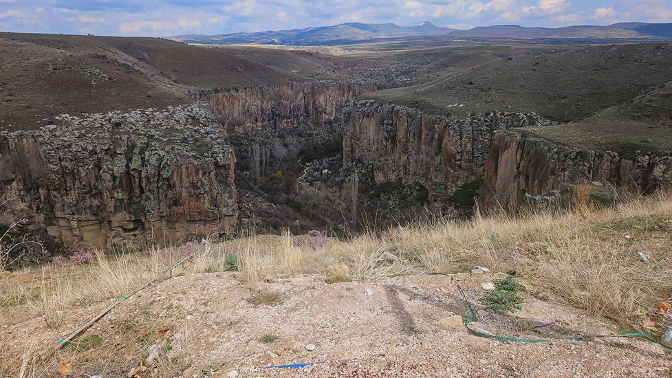 Es war noch früh am Mittag und so ging es in die Ortschaft Belisirma. Auch hier befindet sich ein Zugangspunkt in das Tal. Steil fuhren wir die 10%ig Straße runter ins Dorf. Leider war auf halbem Weg die Straße komplett gesperrt und wir mussten umdrehen. So fuhren wir nach Ihlara auf die dort befindlichen „Ihlara Cam Teras“. Dies ist ein Cafe mit einer Aussichtsplattform. Leider kostete diese Plattform Eintritt. Nur 100m davor war ein geschlossenes Restaurant mit ähnlichem Blick in das Tal. So parkten wir kurz an dieser Stelle.