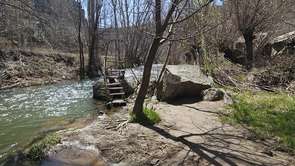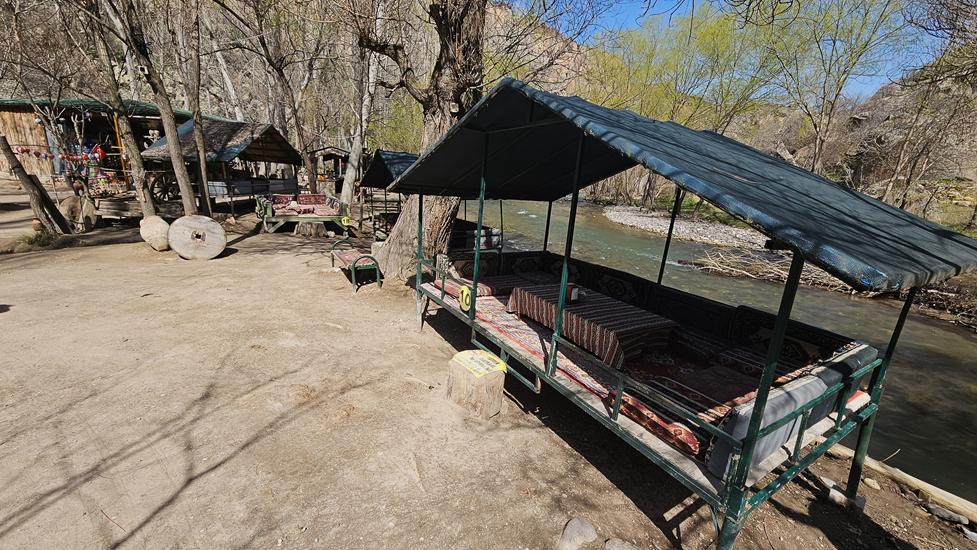 Tatsächlich trafen wir lange Zeit keine weiteren Personen. War eine Kirche am Weg, hieß es steile Treppen nach oben erklimmen. In Belisirma drehten wir um und gingen auf der anderen Seite des Flußes zurück. Im Tal befinden sich ein großes Cafe mit Sitzgelegenheiten direkt am Fluß. Da das Cafe auf dem Rückweg auf der anderen Flußseite war, überquerten wir die Brücke in der Nähe. Was für ein toller Ort, der Fluß rauschte und der Ausblick auf die steilen Felswände war einfach grandios. Wir bestellten zwei Cay und zwei Gözleme, die von 2 Frauen frisch zubereitet wurden und super schmeckten.