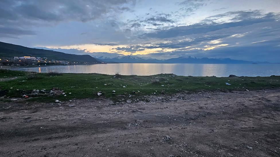 Der Schnee stoppte uns und es waren immer noch 12 km bis zum Ziel. Wir trösteten uns, dass wir einen höheren See mit dem Kari-See bereits gesehen hatten. Um diese Jahreszeit muß man mit sowas rechnen und so drehten wir um und fuhren am See entlang in Richtung der Stadt Van. Wieder genoßen wir diese fantastische Landschaft. Auf Höhe der Insel Akdamar fanden wir auf einer kleinen Landzunge einen Stellplatz. Am Abend hatten wir das beleuchtete Tatvan und Van im Blick und davor die Akdamar Kirche auf der Insel. Es war ein wunderbarer Platz, leider mit vielen Glasscherben.