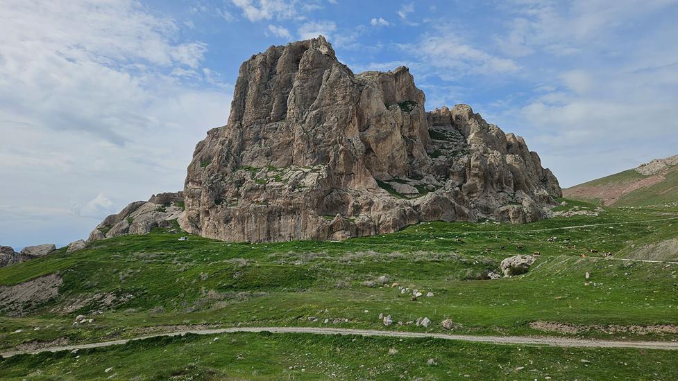 Wir schipperten zurück und fuhren statt zurück nach Tatvan in Richtung der Stadt Van zur Burg Amik die vor einem einzelnen großen Felsen liegt. Dieser Felsen ist von einer hügeligen Landschaft umgeben und das sieht fantastisch aus. Die kleine Burg ist dabei kaum von unten an diesem großen Felsen zu sehen.