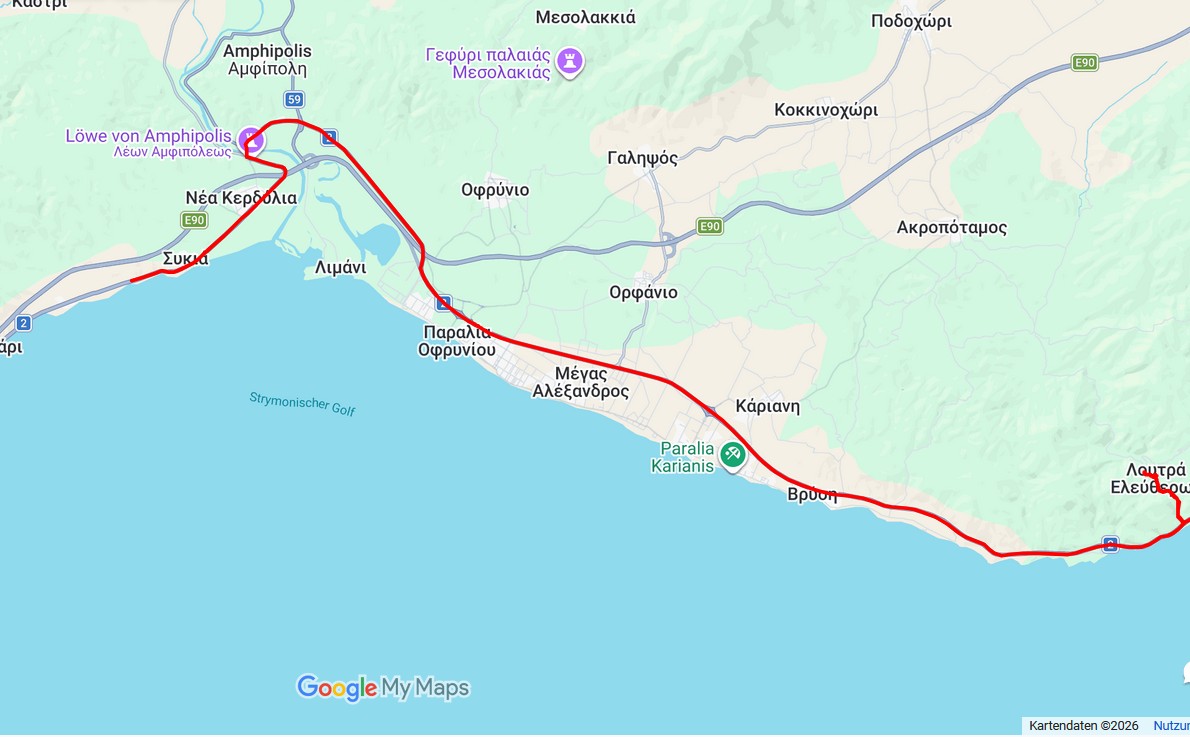 Strecke: Eleftheres – 60 km bis 17 Grad, sonnig